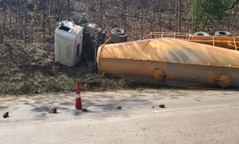 तेज रफ्तार बल्कर हादसा, पहाड़ी से टकराकर पलटा वाहन, ड्राइवर गंभीर,रीवा रेफर की तैयारी